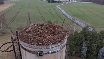 Auf einem stillgelegten Industrieschornstein in Neschwitz, in luftigen 25 Meter Höhe, zieht ein…